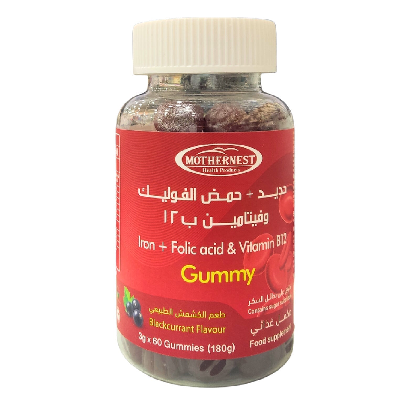 ماذرنست حديد وحمض فوليك وفيتامين B12 مكمل غذائي لعلاج فقر الدم، وتعويض نقص الحديد أو فيتامين ب12 أو حمض الفوليك في الجسم، وهو بطعم الكشمش الطبيعي.