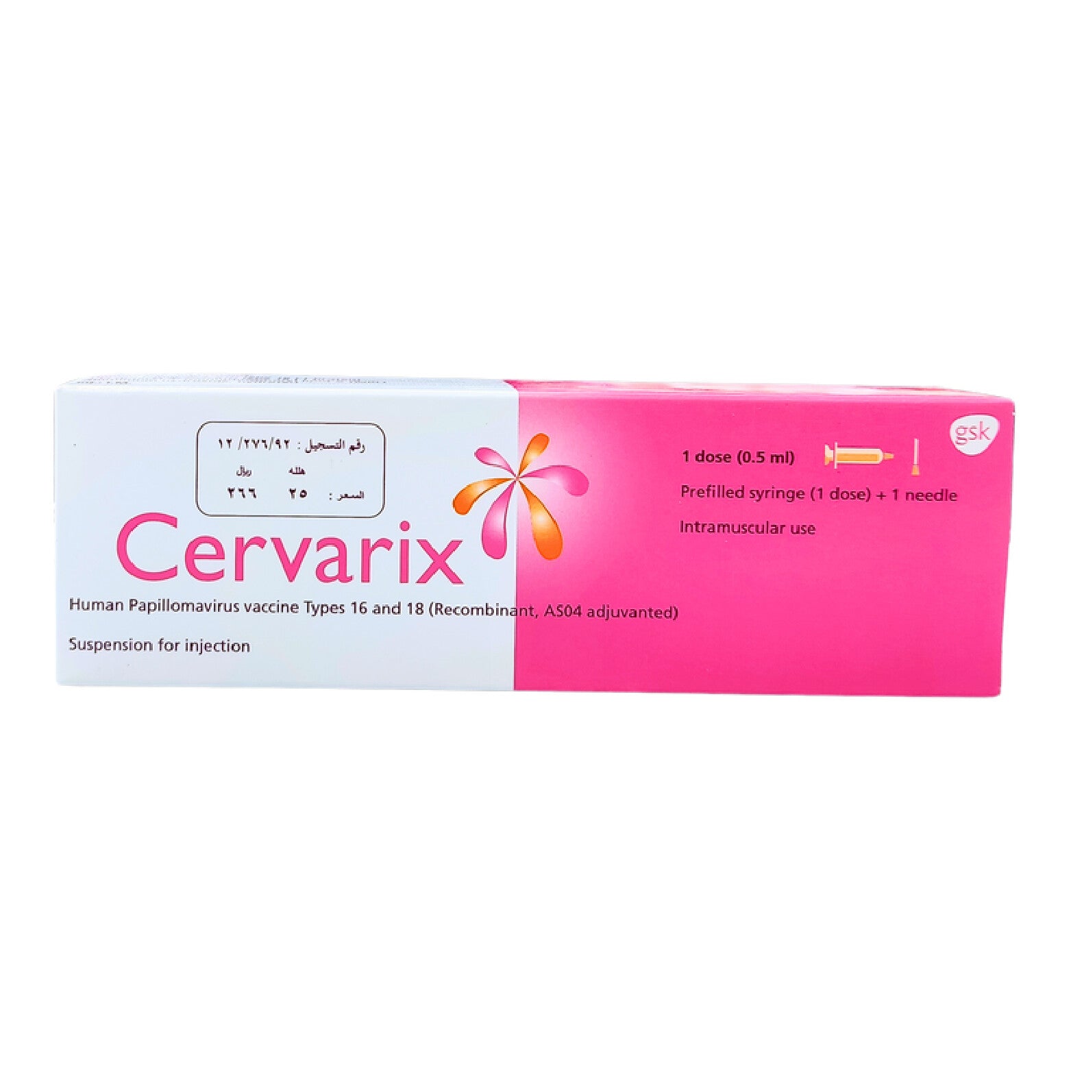 لقاح سيرفاريكس جرعة واحدة 0.5 مل للوقاية من سرطان عنق الرحم، إذ يوفّر وقاية من فيروس الورم الحليمي البشري، الذي يسبّب سرطان عنق الرحم لدى السيدات.