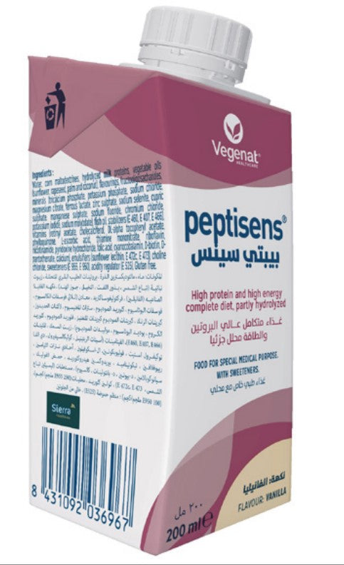 بيبتي سينس تركيبة مُحلّلة جزئيًا، غنية بالفيتامينات والمعادن والبروتين، وكافة العناصر الغذائية التي يحتاج إليها الجسم، وتُساعِد في تعويض نقص المُغذّيات كما في حالات سوء الامتصاص أو زيادة احتياج الجسم إلى الطاقة.